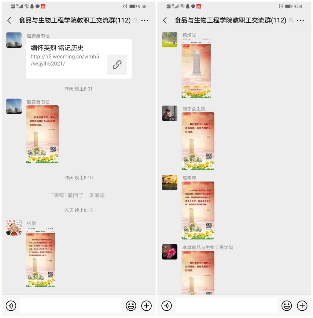 公司师生通过手机H5或中国文明网微信公众号进行网上献花,在微信群、QQ群进行祭英烈留言。何京京老师留言:我们要弘扬先烈的崇高精神,革命传统要牢牢记在心头,以此激励我们、警示我们,要珍惜革命先烈用鲜血和生命换来的今天社会安定祥和、经济持续增长、人民安居乐业的美好生活;20食安02田笑留言:我们要弘扬先烈的崇高精神,革命传统要牢牢记在心头,以此激励我们、警示我们,要珍惜革命先烈用鲜血和生命换来的今天社会安定祥和、经济持续增长、人民安居乐业的美好生活。