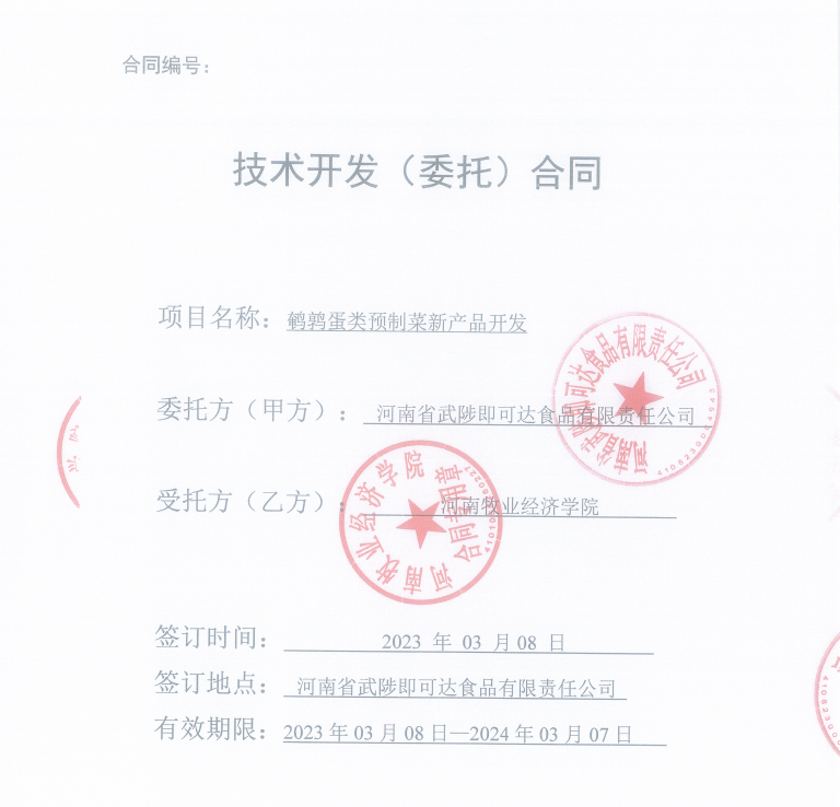 近日,公司预制菜团队与河南武陟即可达食品有限公司签订“鹌鹑蛋类预制菜新产品开发”横向项目,本项目由团队成员张煌博士主持,许文涛教授、许美娟和赵钰泽博士作为主要参与人员,相关项目经费目前已到账。